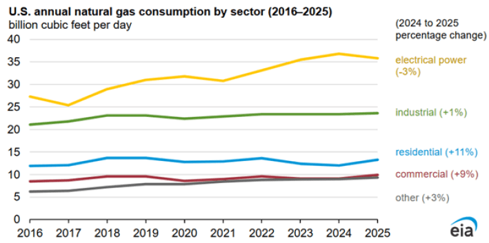 The U.S. Energy Information Administration (EIA) reported (U.S. natural gas consumption set a monthly and yearly record in 2025 – U.S. Energy Information Administration (EIA)) natural gas consumption averaged a record 92 billion cubic feet per day (Bcf/d) in 2025 and set a new winter monthly record of 126.6 Bcf/d in January 2025. Overall, U.S. natural gas consumption last year increased 2 percent (1.7 Bcf/d) from 2024. In January 2025, natural gas consumption was up 5 percent (6.3 Bcf/d) compared with January 2024. However, changes in U.S. natural gas consumption in 2025 varied by sector with residential and commercial consumption accounting for most of the year-over-year increase, particularly during the first quarter of 2025.