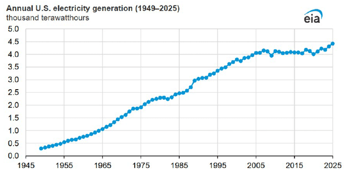 According to the U.S. Energy Information Administration (EIA), U.S. electricity net generation reached a record in 2025 (U.S. electricity generation in 2025 hit a record, again – U.S. Energy Information Administration (EIA)). In 2025, the United States generated 4.43 thousand terawatt hours (TWh) of electricity, up 2.8 percent from 2024 generation, which previously had been the highest annual total in EIA’s dataset dating back to 1949.